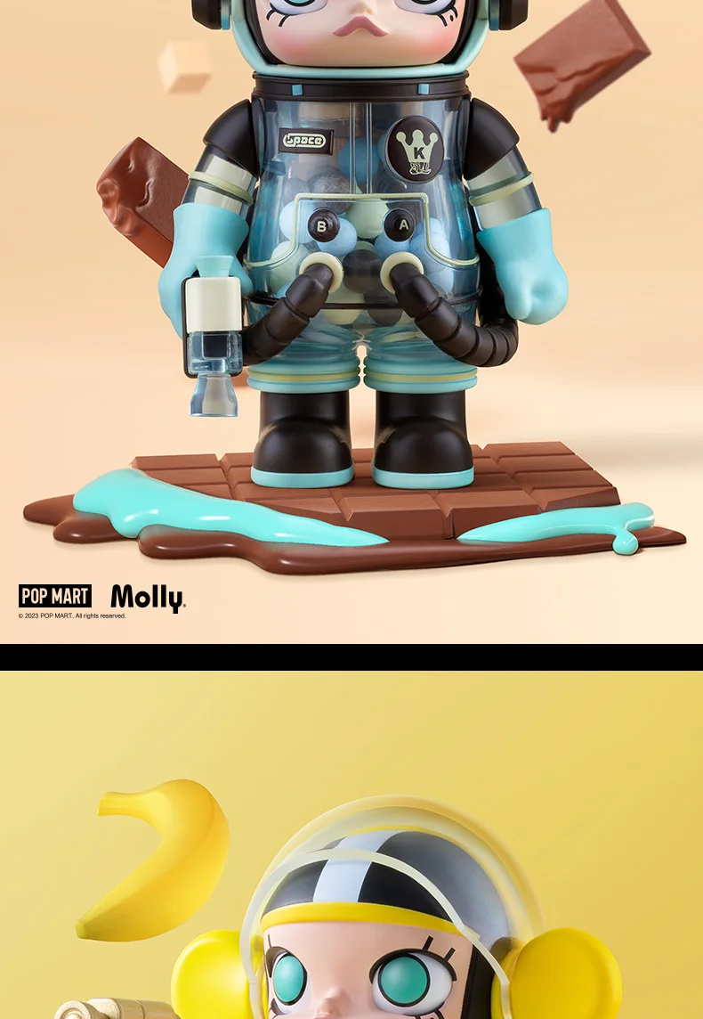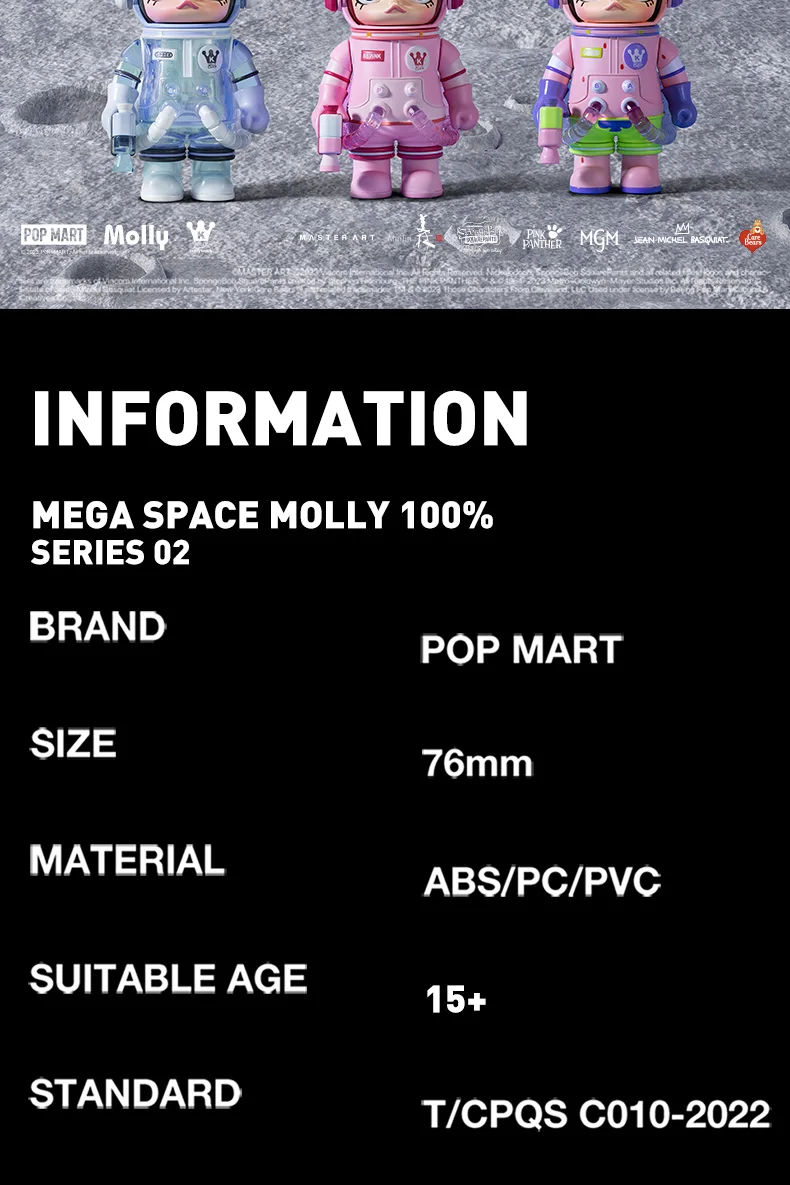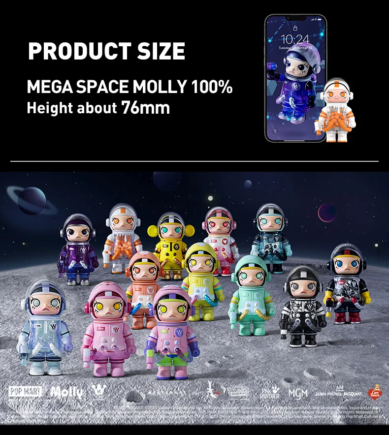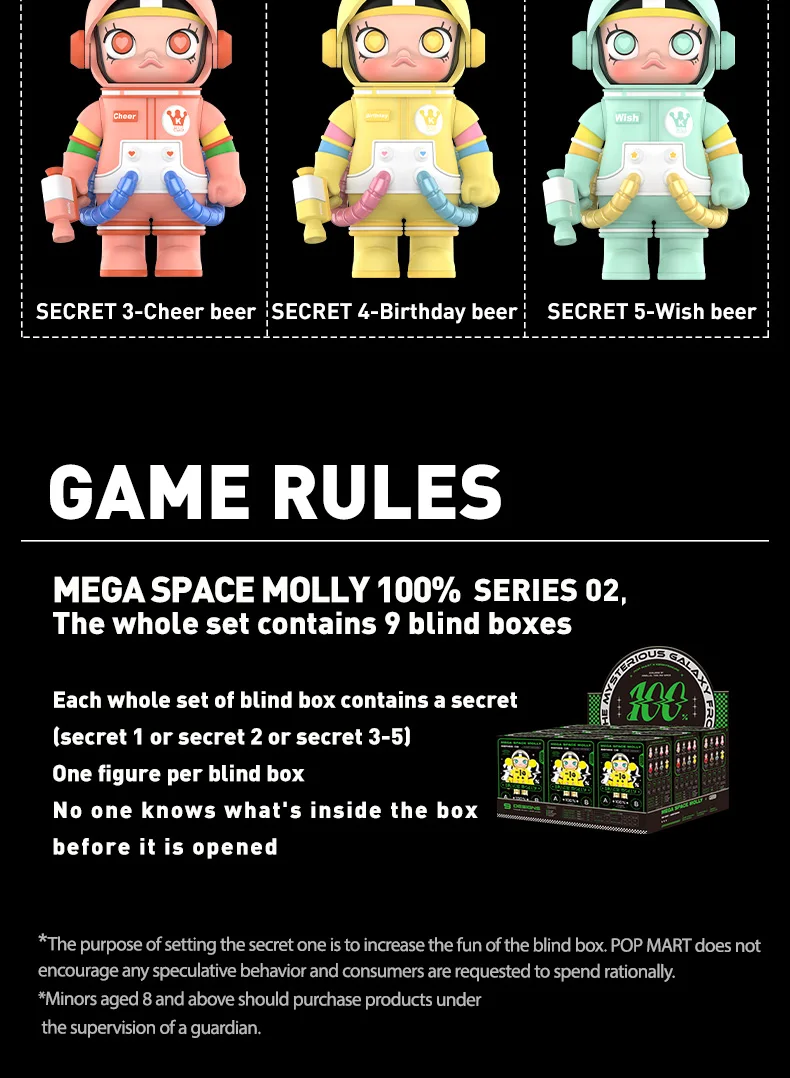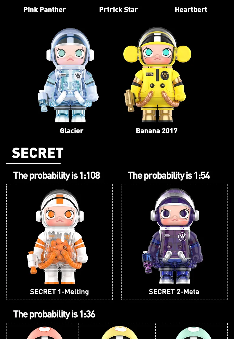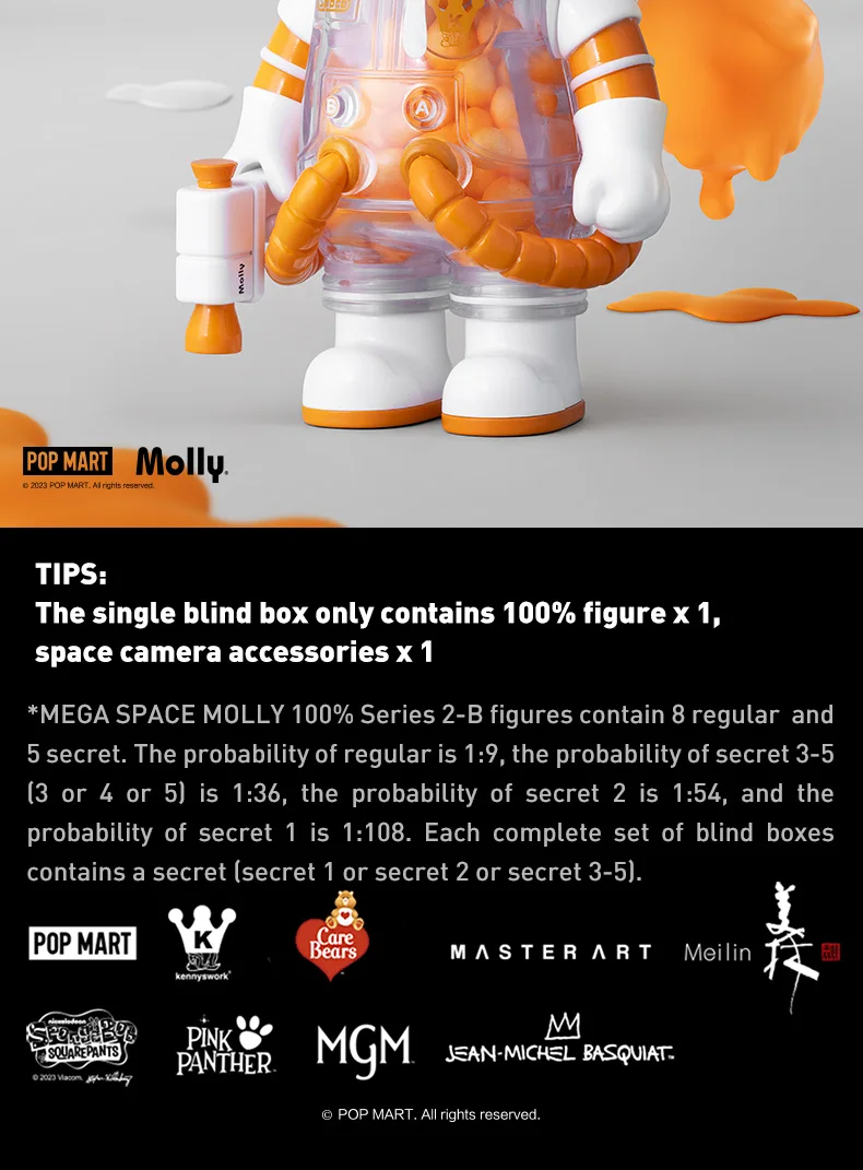 MEGA SPACE MOLLY 100% Series 2-B contain 8 regular and 5 secret. The probability of regular is 1:9, the probability of secret 3-5 (3 or 4 or 5) is 1:36, the probability of secret 2 is 1:54, and the probability of secret 1 is 1:108. Each complete set of blind boxes contains a secret. The whole set contains 9 blind boxes